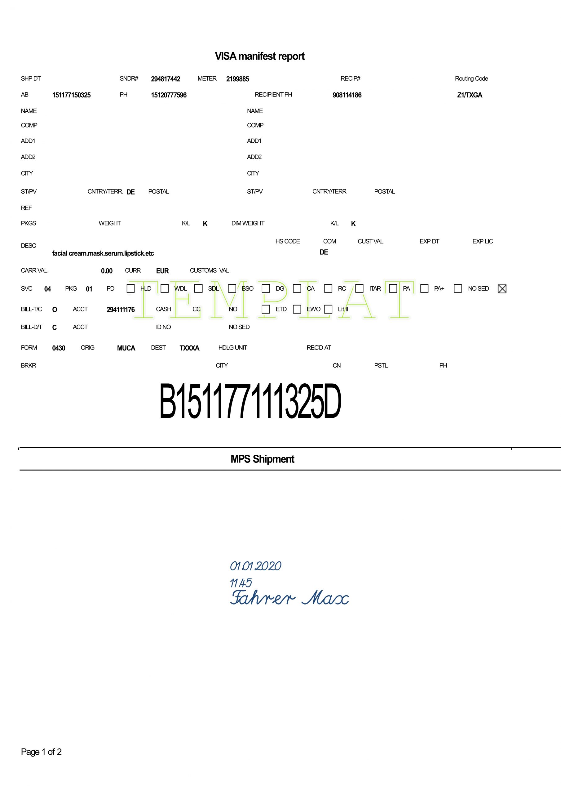 如果您的貨物超過 1000 歐元,按德國规定則必须報關,報關後會另外有一個 MRN 的報關單(P5)請列印三份,加上以上文件一併交給收貨司機